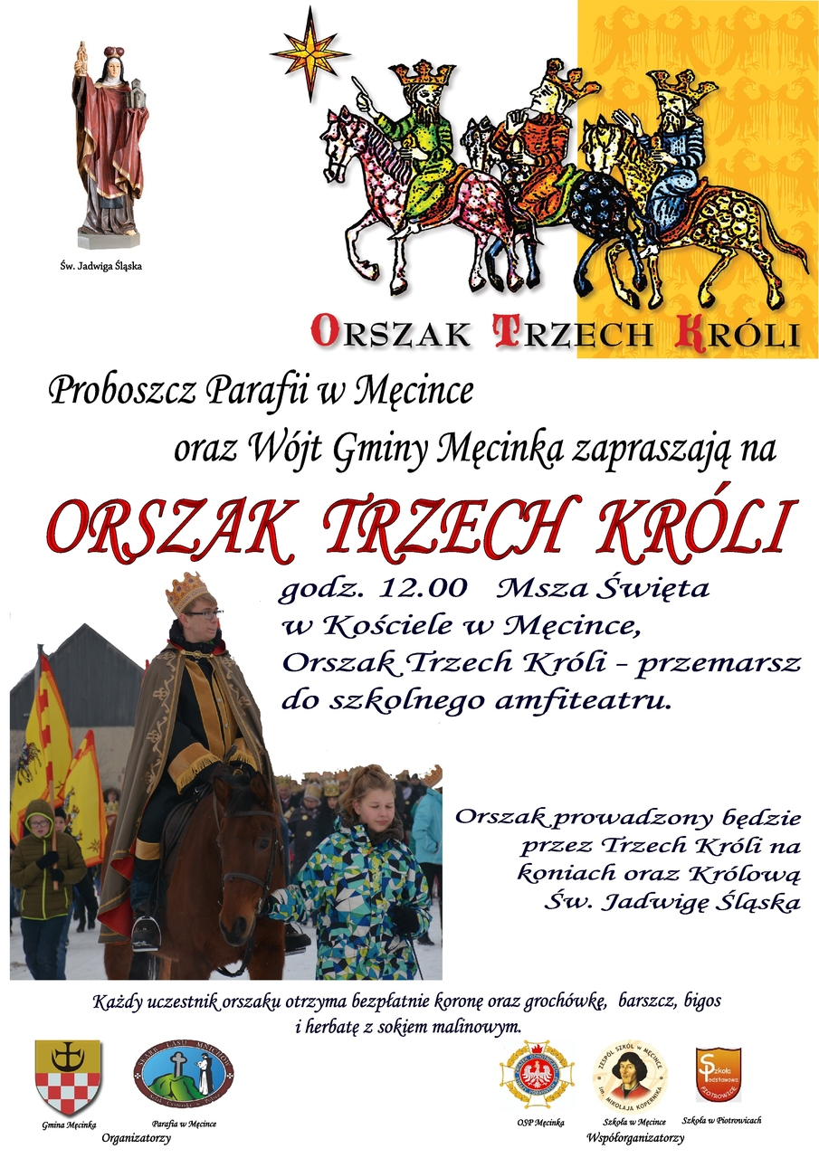 Orszak Trzech Króli poniedziałek, 02, styczeń 2017 11:31 Drukuj fUdostępnij Proboszcz Parafii w Męcince oraz Wójt Gminy Męcinka zapraszają na Orszak Trzech Króli.Plakat do pobrania