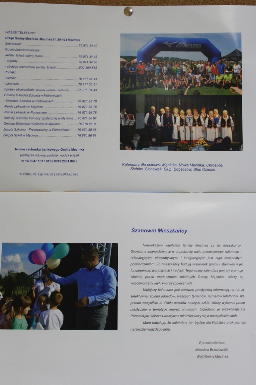 „Tegoroczny kalendarz gminny promuje pracę społeczności lokalnych Gminy Męcinka, którzy są współtwórcami wielu imprez społecznych. Niniejszy kalendarz jest zarówno praktyczną informacją na temat selektywnej zbiórki odpadów, ważnych terminów, numerów telefonów, ale przede wszystkim to dzieło uczniów naszych szkół, którzy wykonali prace plastyczne o tematyce imprez gminnych. Oglądając je przekonają się Państwo jak twórcza i kreatywna młodzież uczy się w naszych szkołach. Mam nadzieję, że kalendarz ten będzie dla Państwa praktycznym narzędziem każdego dnia” – mówi wójt M. Brzozowski.