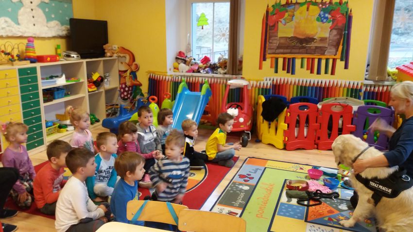 Przedszkolaków z Punktu Przedszkolnego Słoneczko w Pomocnem odwiedził specjalny gość – pies Futuro z terapeutą integracji sensorycznej - Małgorzatą Hasiuk.