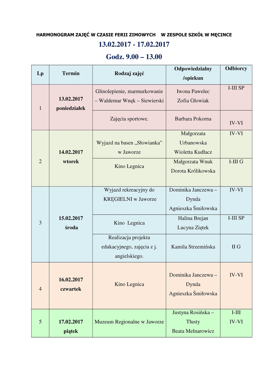 Ferie w Gminie Męcinka piątek, 10, luty 2017 07:59 Drukuj fUdostępnij Plan zajęć dla dzieci i młodzieży podczas ferii zimowych w roku szkolnym 2016/2017 na terenie gminy Męcinka.