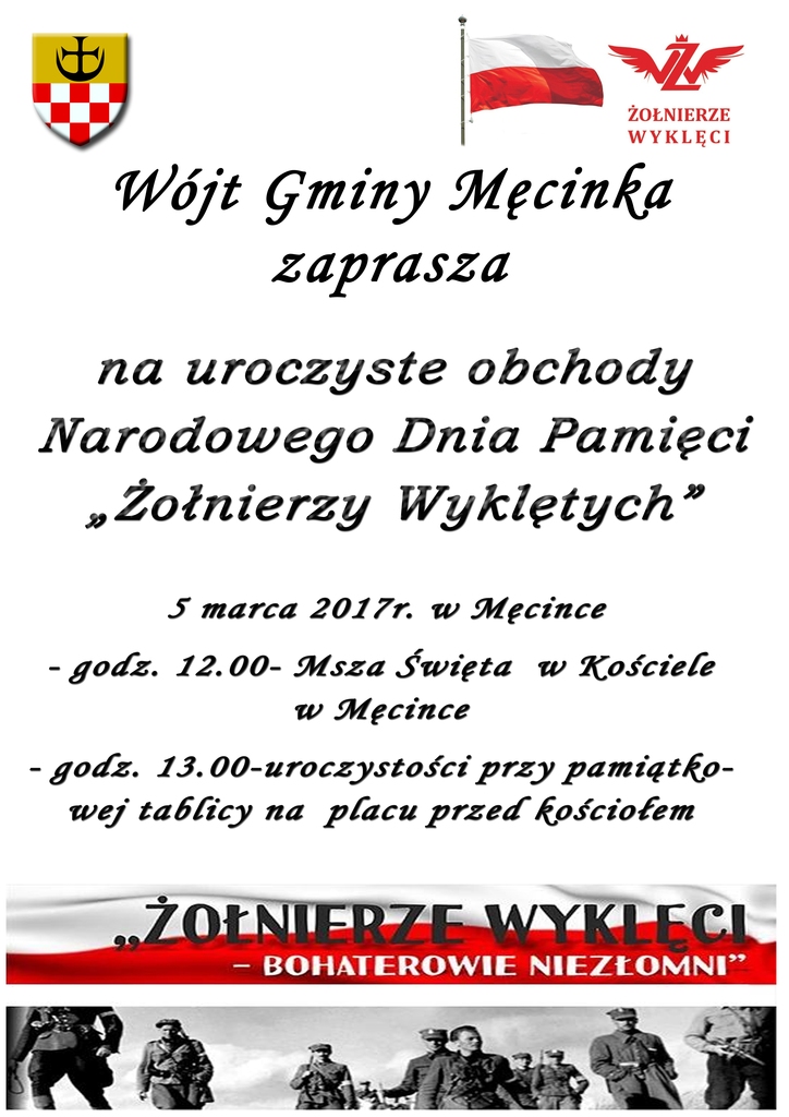 Wójt Gminy Męcinka zaprasza na uroczyste obchody Narodowego Dnia Pamięci „Żołnierzy Wyklętych” poniedziałek, 27, luty 2017 15:56 Drukuj fUdostępnij