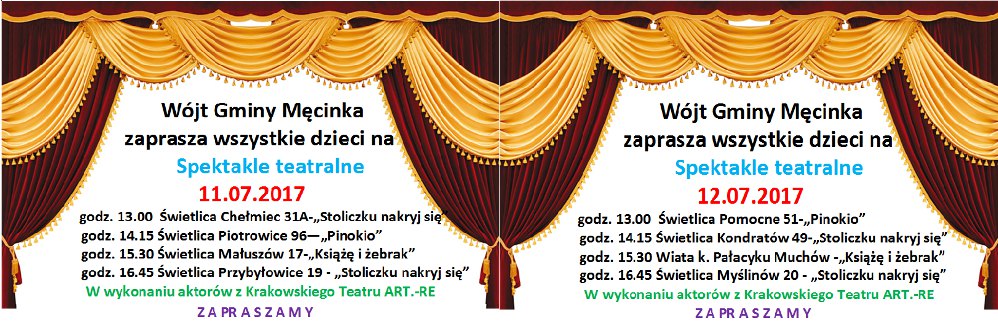 Wójt Gminy Męcinka zaprasza wszystkie dzieci na Spektakle teatralne środa, 05, lipiec 2017 13:07 Drukuj fUdostępnij Powiększ plakat (format JPG)