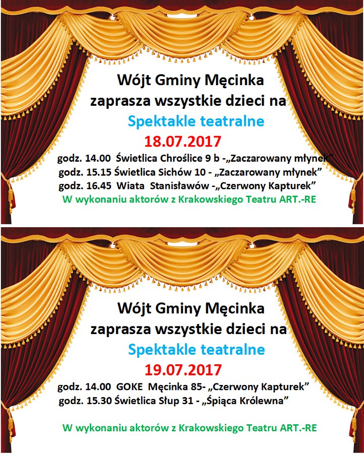Wójt Gminy Męcinka zaprasza wszystkie dzieci na Spektakle teatralne czwartek, 13, lipiec 2017 10:50 Drukuj fUdostępnij Powiększ zaproszenia (format JPG)