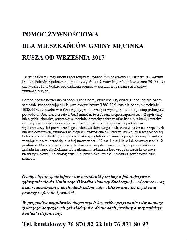 W związku z Programem Operacyjnym Pomoc Żywnościowa Ministerstwa Rodziny Pracy i Polityki Społecznej z inicjatywy Wójta Gminy Męcinka od września 2017 r. do czerwca 2018 r. będzie prowadzona pomoc w postaci wydawania artykułów żywnościowych.