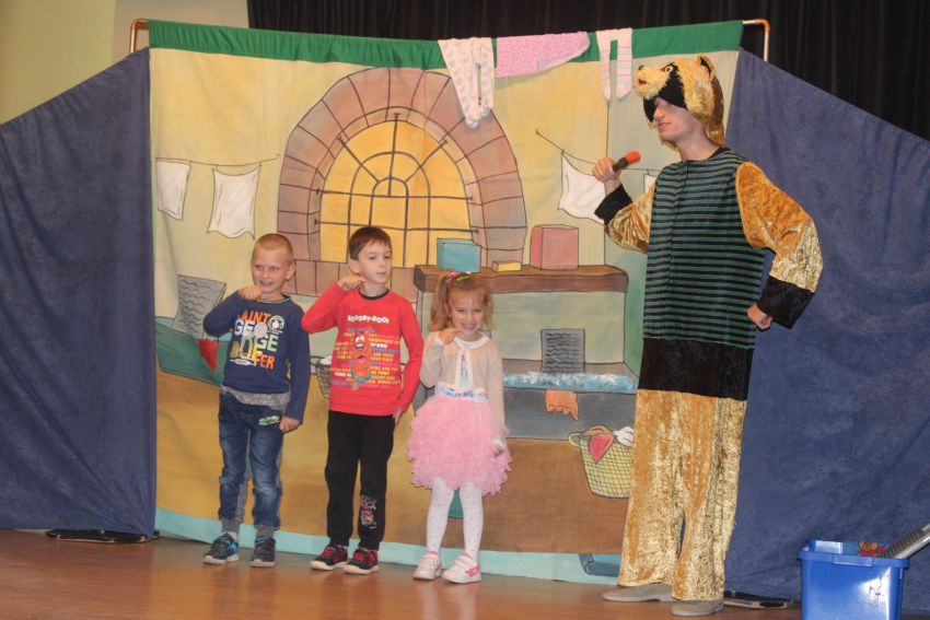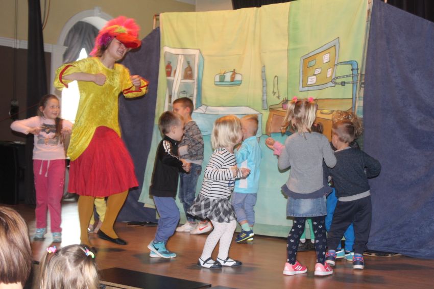 Spektakle teatralne odbyły się 18 października br. w wykonaniu aktorów z Krakowskiego Teatru ART-RE. Aktorzy Zaprezentowali dzieciom adaptację scenariusza wiersza „Kaczka Cudaczka” Jana Brzechwy. Bohaterką opowieści jest niezwykła Kaczka - Cudaczka. Do szopa - pracza idzie w sprawie wyprania piórek. Papuga - fryzjerka ma zmienić jej uczesanie na bardziej twarzowe. Kaczkę Cudaczkę boli głowa idzie więc do sowy - aptekarki. Wreszcie w swojej wędrówce trafia do gabinetu lekarskiego gdzie porad udziela doktor - dzięcioł.