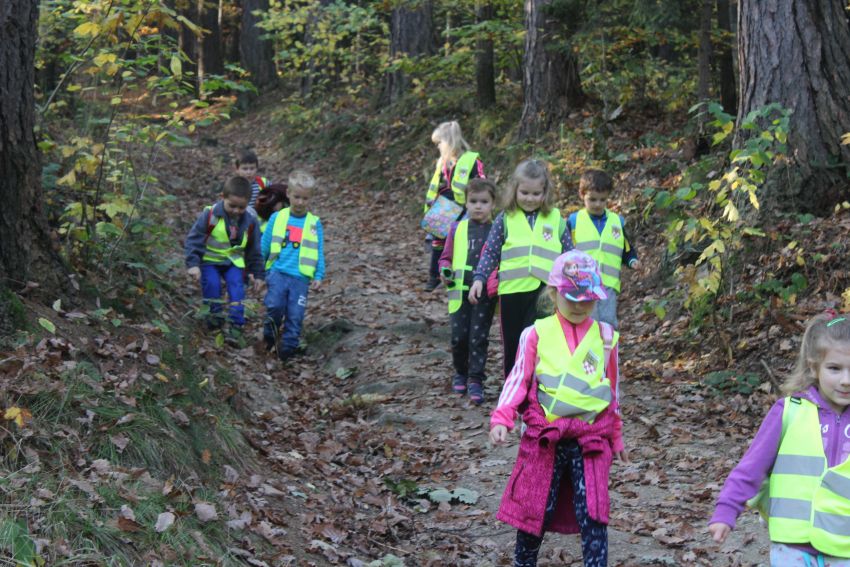 Przedszkolaki wygodnie ubrane dzielnie maszerowały, śmiejąc się i zbierając po drodze szyszki, kamyki bazaltu. Od czasu do czasu zatrzymywały się, aby podziwiać urokliwy krajobraz Parku Krajobrazowego „Chełmy”. Dzieci dowiedziały się, co to takiego szlak turystyczny, gdzie zazwyczaj rosną paprocie. Zobaczyły, jak wygląda mech i usłyszały, że wskazuje on kierunek północny, że z dzikiej róży możemy zrobić zdrową herbatkę, a ta biała kora drzew to brzoza. Buki, klony, lipy, jesiony i dęby mieniły się różnobarwnością liści… Maluchy chętnie zgodziły się na powtórzenie tej wycieczki, tym razem wiosną spróbujemy wejść na sam szczyt góry Górzec.