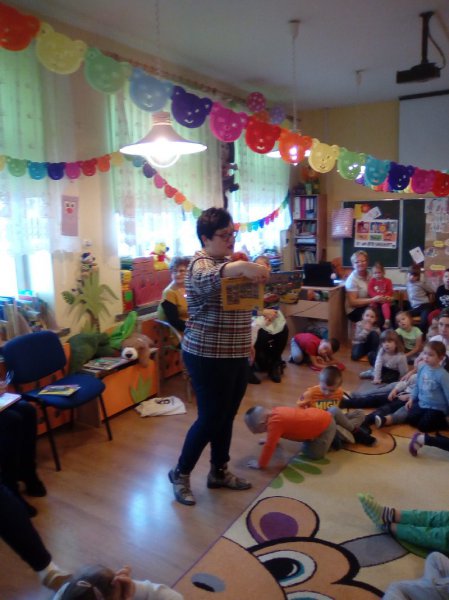 Dzieci wykazały duże zainteresowanie bajkami i odpowiadały na zadawane pytania. Spotkanie zakończyło się poczęstowanie dzieci słodyczami.
