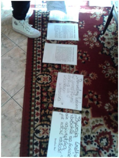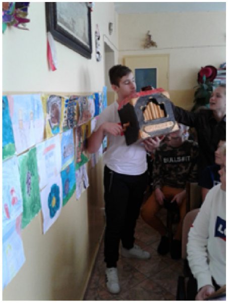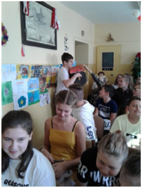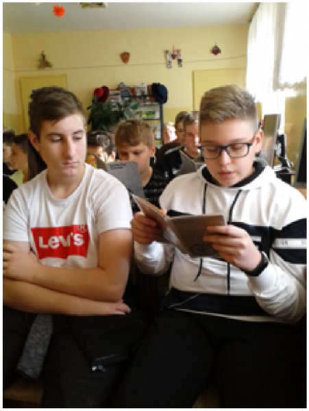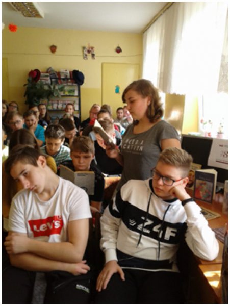 Uczestnikami spotkania w bibliotece dnia 12 września byli uczniowie klas VII i VIII oraz zaproszeni goście: Dyrektor Zespołu Szkolno-Przedszkolnego Jolanta Cisoń, kierownik GBP Elżbieta Chodor, a całą inicjatywę przygotowały nauczycielki p. Bożena Moderacka i p. Nina Wiktorowska. Uczniowie po przeczytaniu lektury zaprezentowali katarynki, które wykonali samodzielnie. Polonistka p. Nina Wiktorowska opracowała karty pracy z mapami myśli, które na podstawie przeczytanej lektury uzupełniali uczniowie.