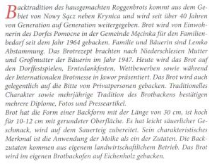 Tradycja wypieku chleba Anieli Pańczak pochodzi z terenów spod Nowego Sącza koło Krynicy i jest przekazywana z pokolenia na pokolenie od ponad 40 lat. Recepturę jego wypieku na Dolny Śląsk przywiozła mama i babcia gospodyni w 1947 roku. Cechą charakterystyczną jest wykorzystywanie serwatki jako dodatku. Surowce do wypieku pochodzą z własnego gospodarstwa rolnego. Chleb ten pieczony jest w domowym piecu chlebowym, opalanym drewnem dębowym.