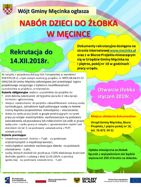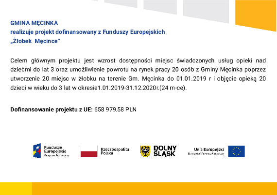 Pragniemy poinformować, iż Gmina Męcinka realizuje projekt dofinansowany z Europejskiego Funduszu Społecznego pn.: “ Żłobek w Męcince”.