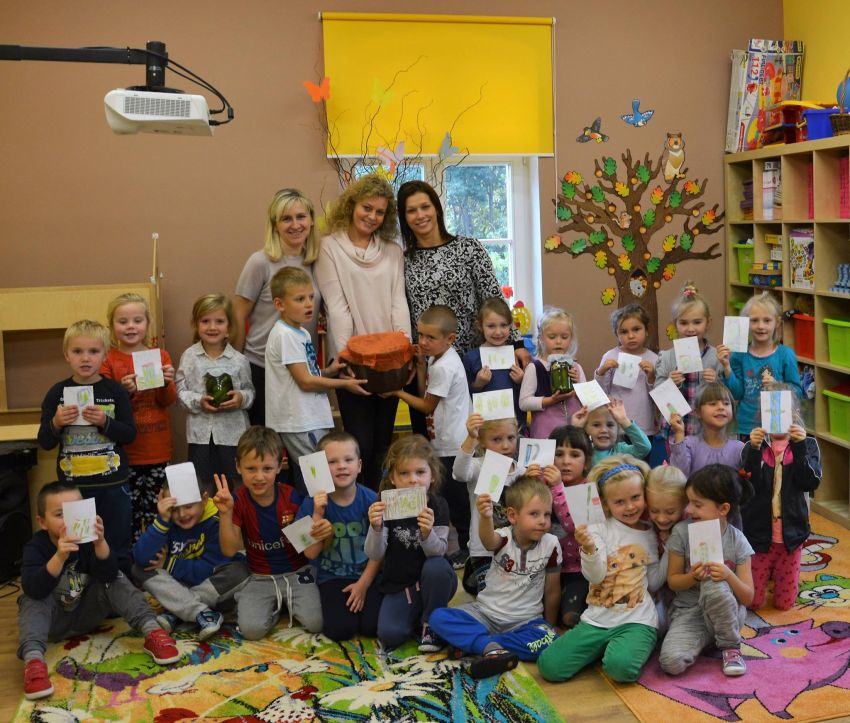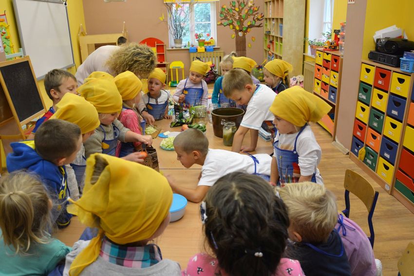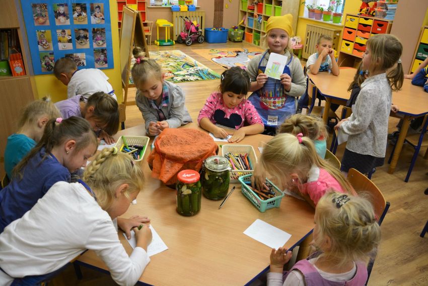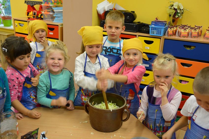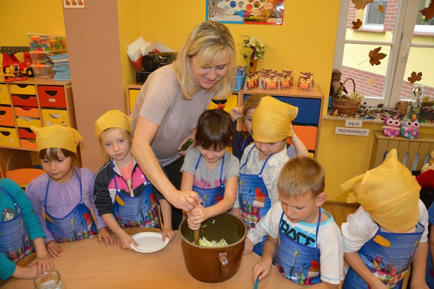 W dniu 11 października dzieci z grupy ”Sowy” i „Motylki” wspólnie zorganizowały niecodzienne zajęcia „kulinarne” - kiszenia ogórków i kapusty. Zanim przystąpiły do pracy, miały okazję poznać te warzywa wszystkimi zmysłami (wzrok, smak, zapach, dotyk).