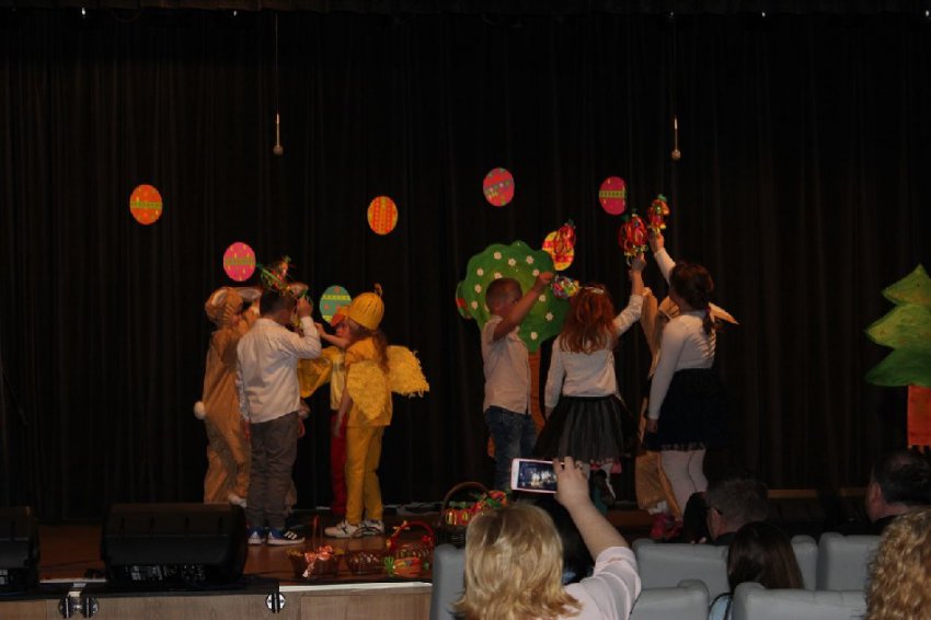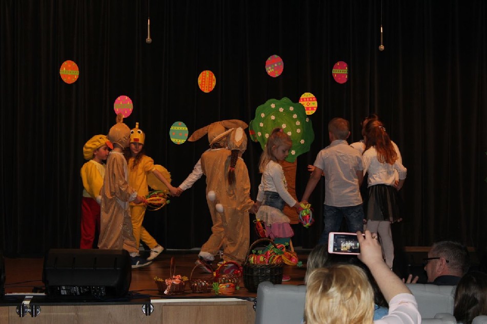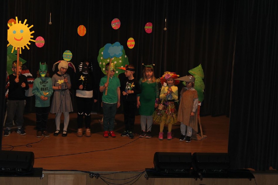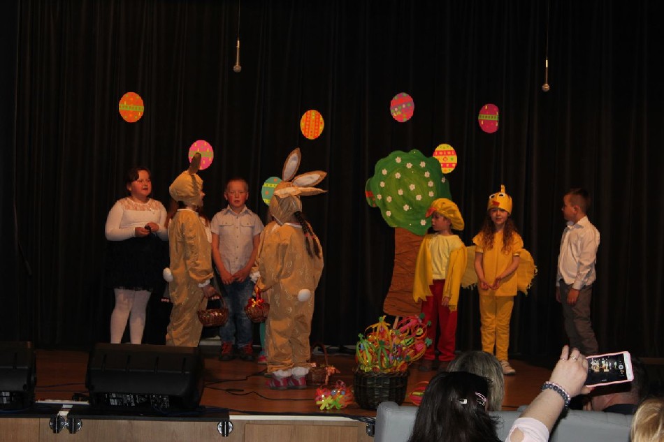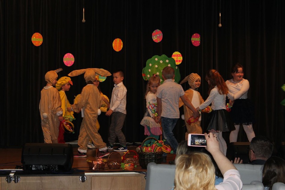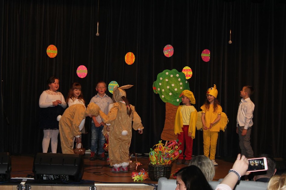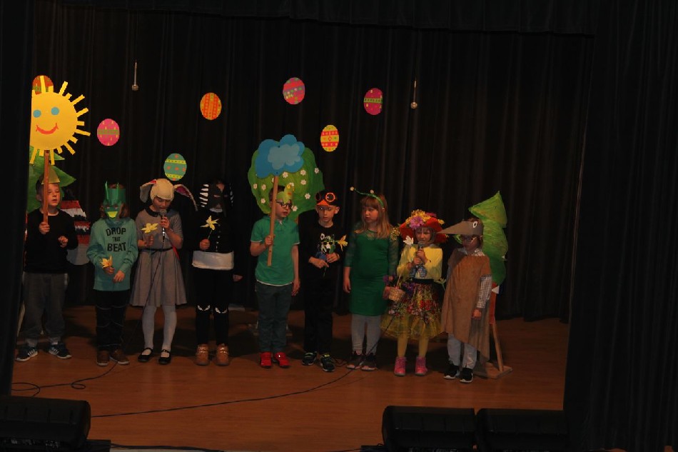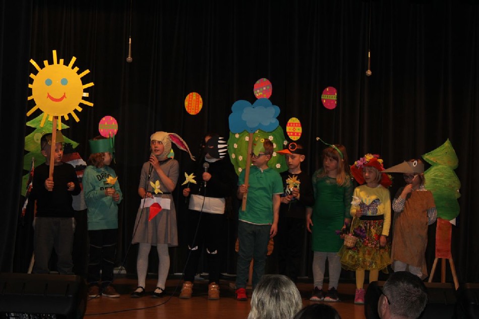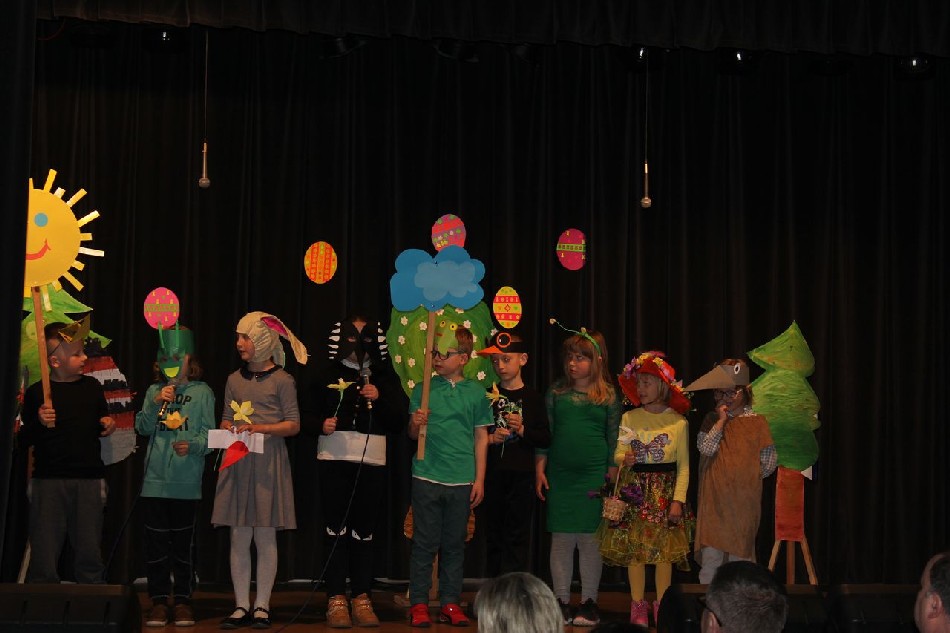Pierwszoklasiści swoim występem nawoływały wiosnę i wraz z przedszkolakami wniosły do spotkania wiele radości i uśmiechu. Duże wrażenie zrobiły na wszystkich wiosenno - wielkanocne stroje dzieci oraz barwne dekoracje. Wszystko to sprawiło, że występ oglądało się z ogromną przyjemnością i na widowni bardzo szybko zagościł wiosenny nastrój.