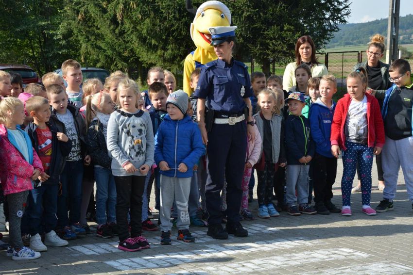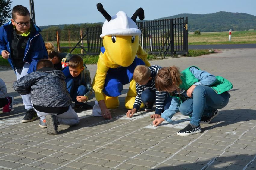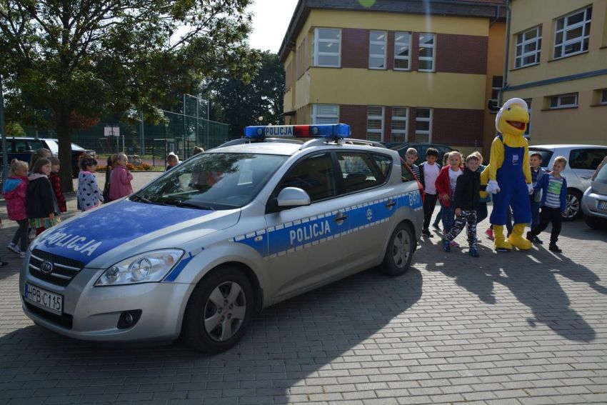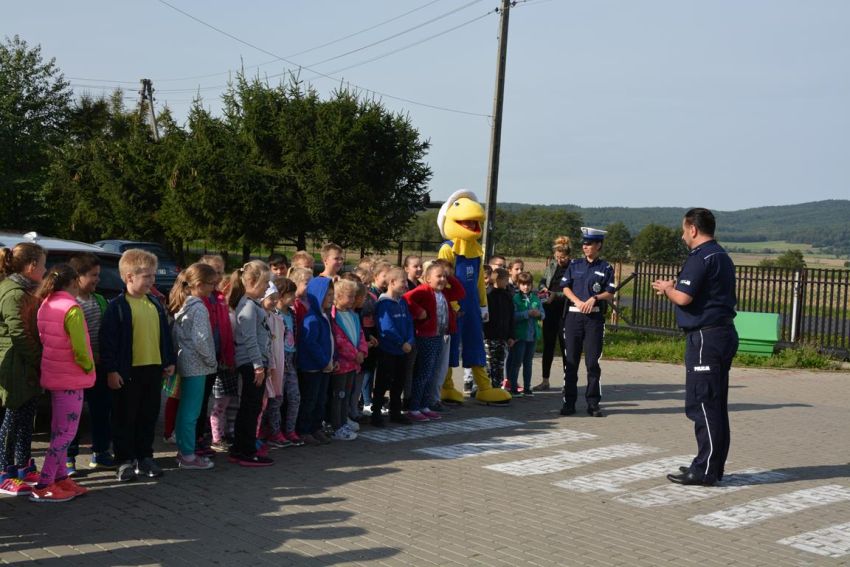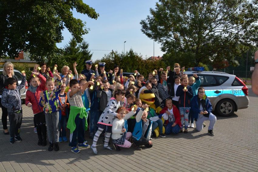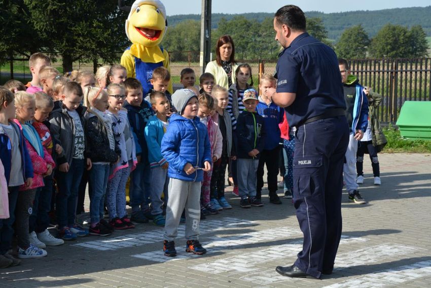 19 września odwiedzili nas wspaniali i nietypowi goście. Byli to policjanci z Jaworskiej Policji Drogowej, przedstawiciel sklepu budowlanego „Mrówka” wraz z pluszową maskotką – symbolem sklepu. Wizyta naszych gości miała na celu przybliżenie, najmłodszym uczniom naszej szkoły, zasad bezpiecznego poruszania się po jezdni oraz prawidłowego przechodzenia przez przejścia dla pieszych. Policjanci przypomnieli nam również o korzyściach noszenia elementów odblaskowych przy ubraniach bądź tornistrze.