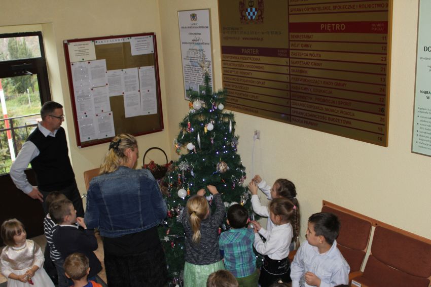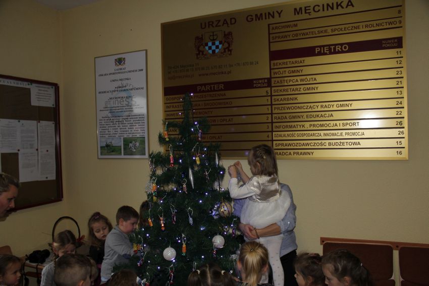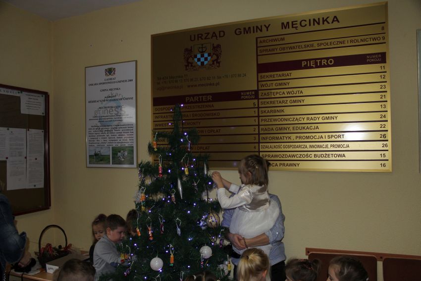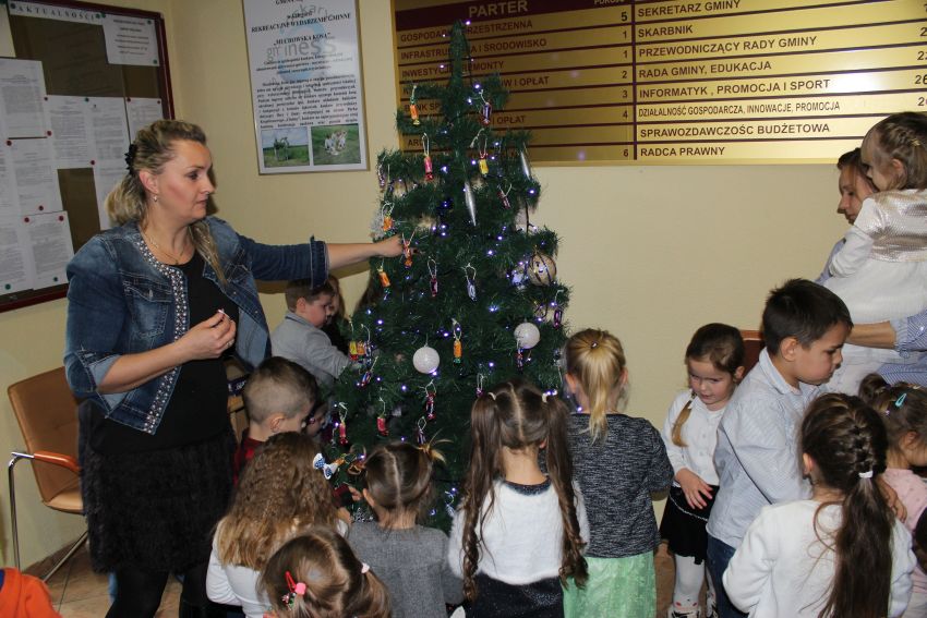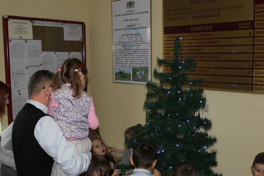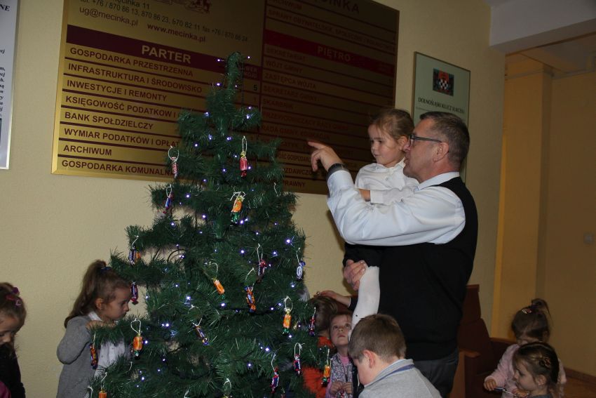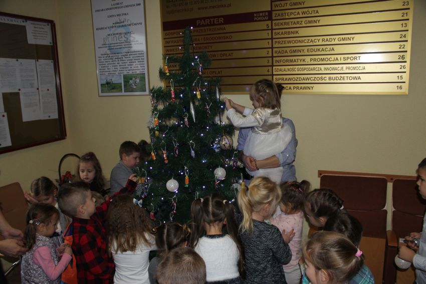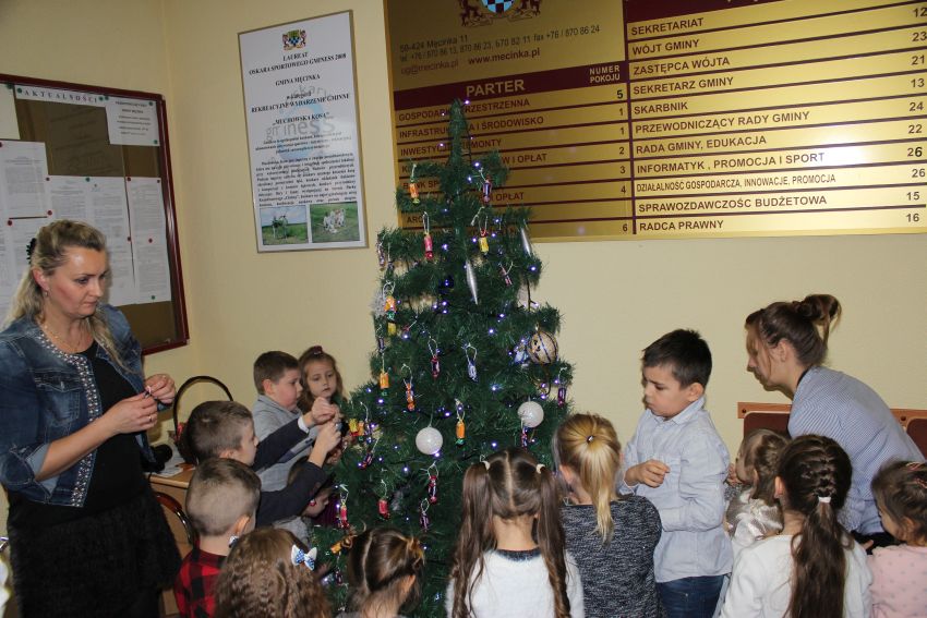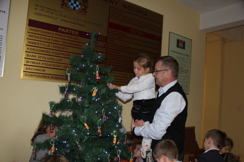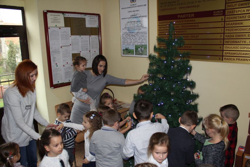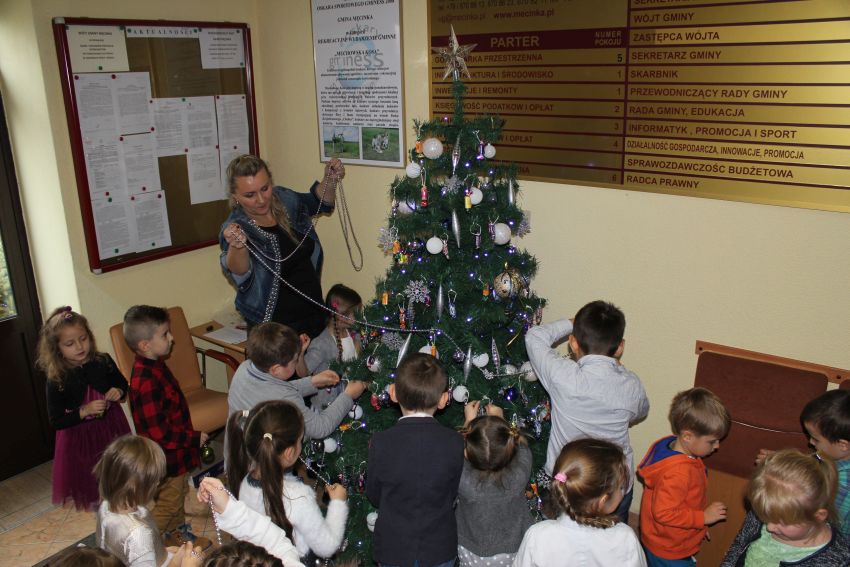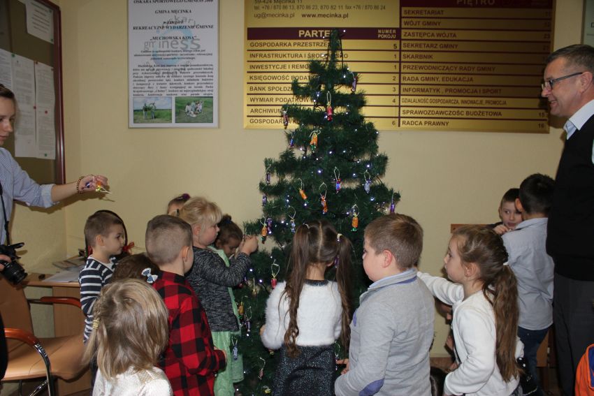 Na zaproszenie wójta przedszkolaki z Męcinki oraz Piotrowic ubierały choinkę w Urzędzie Gminy Męcinka.
