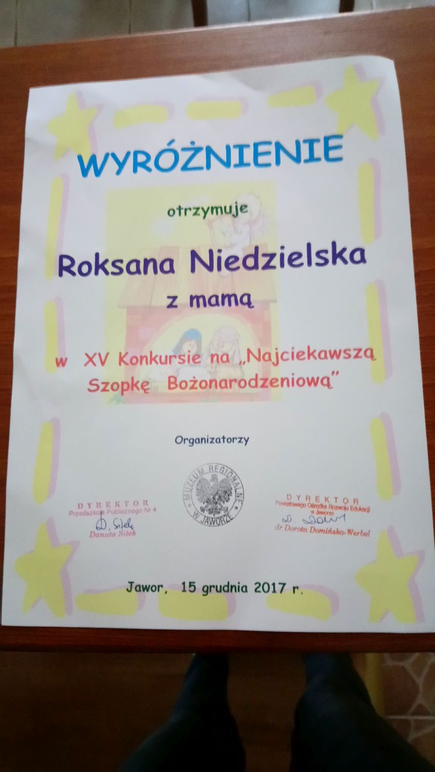 15 grudnia w Muzeum Regionalnym w Jaworze Roksanka Niedzielska z grupy 5 – latków „Krasnali z Planety Dobroci” odebrała dyplom i nagrodę za wyróżnienie w XV Konkursie na „Najciekawszą Szopkę Bożonarodzeniową”.