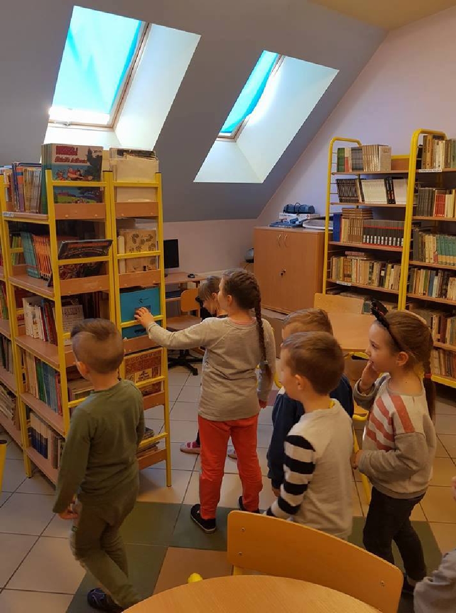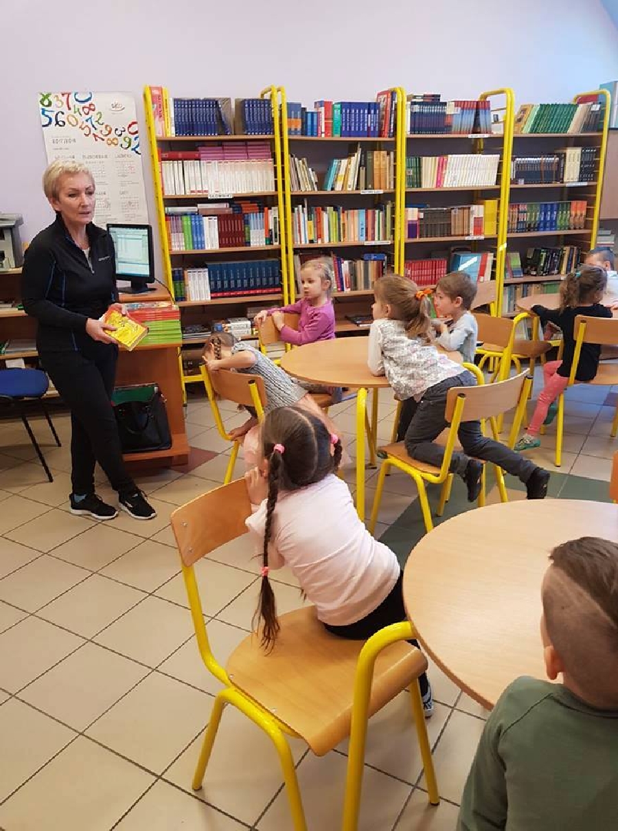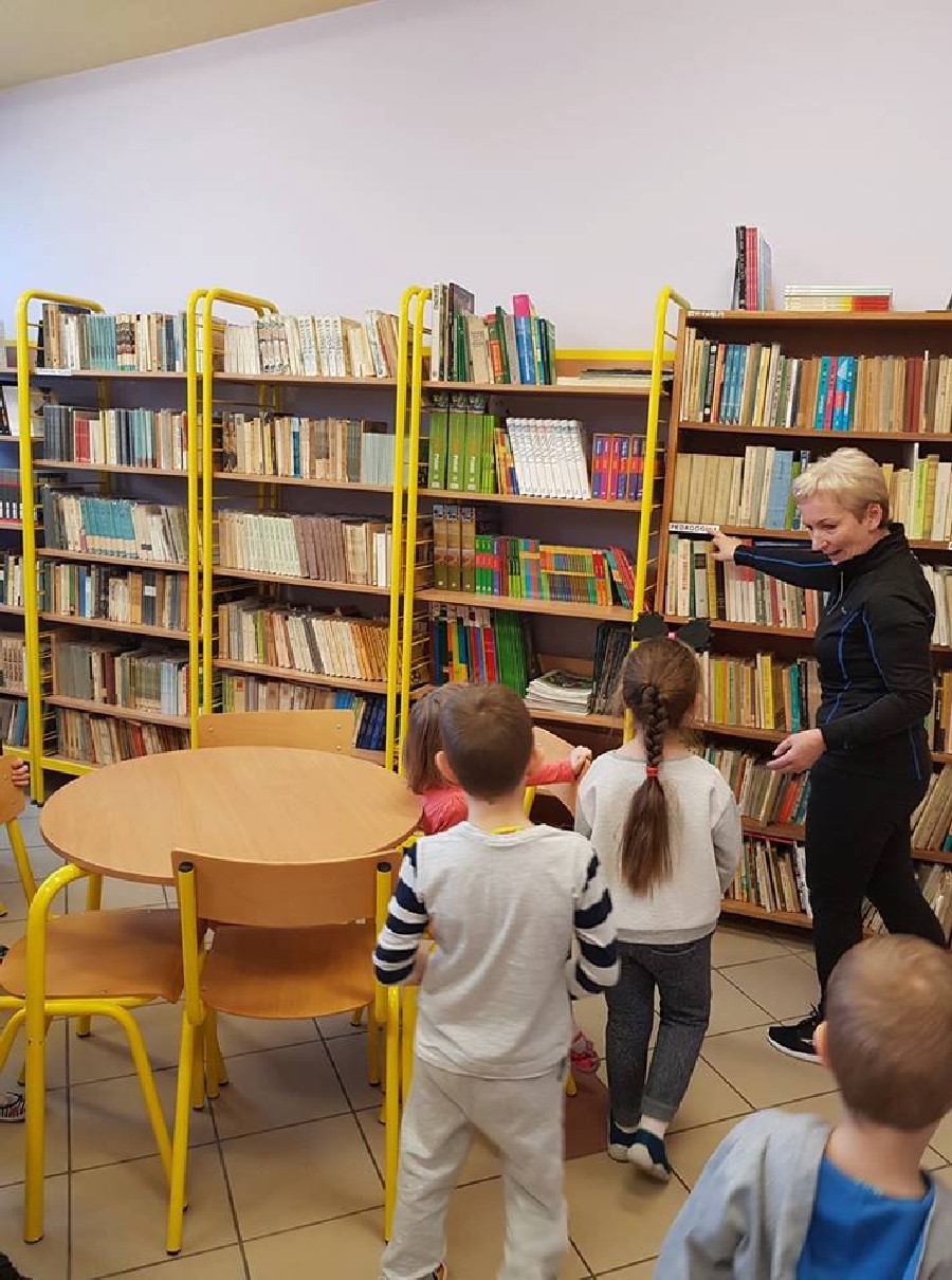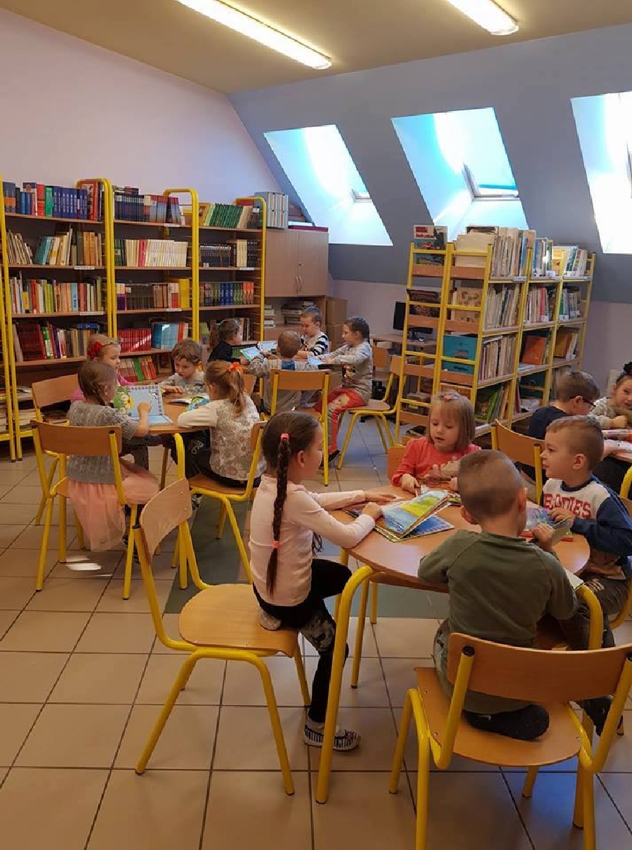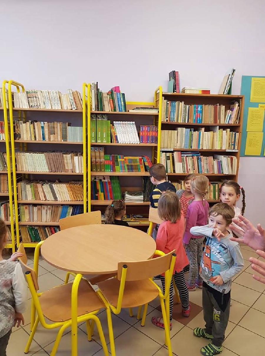Dzieci z przedszkola odwiedziły szkolną bibliotekę. Pani Bibliotekarka pokazała dzieciom, gdzie znajduje się przeznaczony specjalnie dla nich regał z książkami. Następnie zaprezentowała i dała do obejrzenia dzieciom książeczki z działu dziecięcego. Przedszkolakom bardzo spodobały się kolorowe i bogato ilustrowane książeczki, które z chęcią oglądały. Zobaczyły jak wygląda karta czytelnika oraz poznały zasady wypożyczania książek, zachowania się w bibliotece. Dowiedziały się także jak należy dbać o książki. Spotkanie odbywało się w miłej, pełnej uśmiechów i wrażeń atmosferze. Dla wielu przedszkolaków, była to pierwsza wizyta w „domu książek”, ale na pewno nie ostatnia.