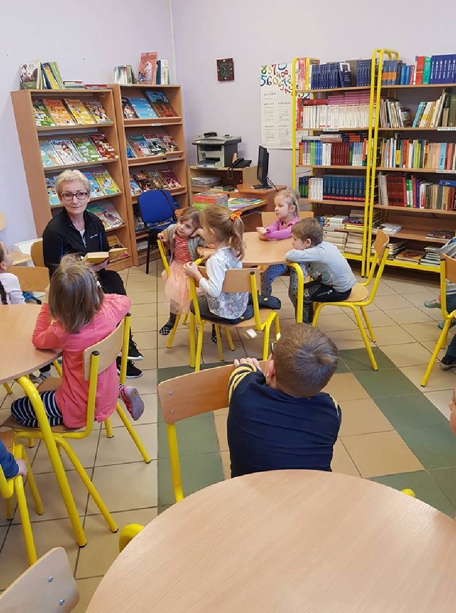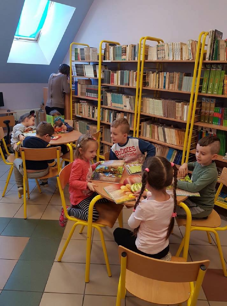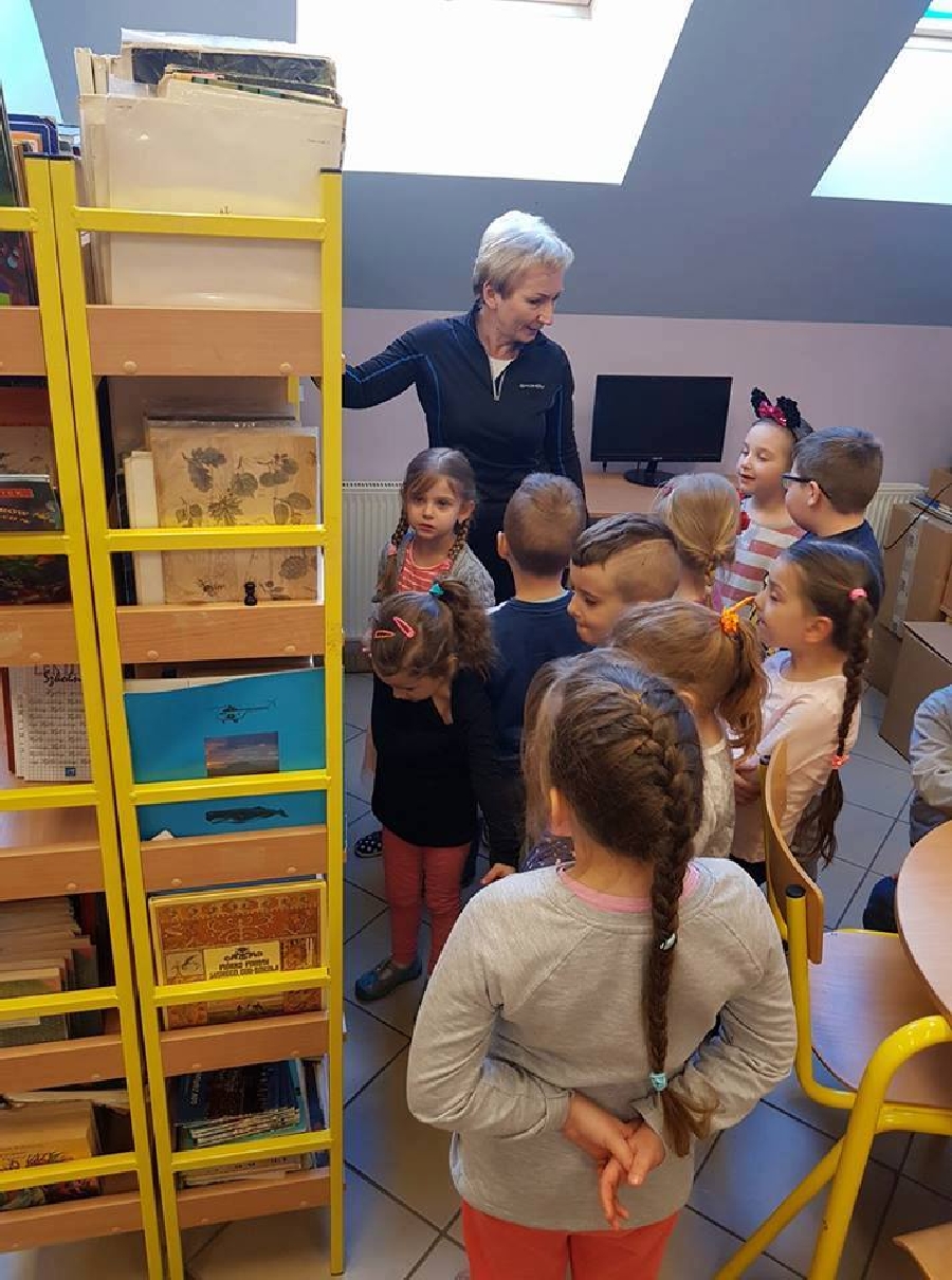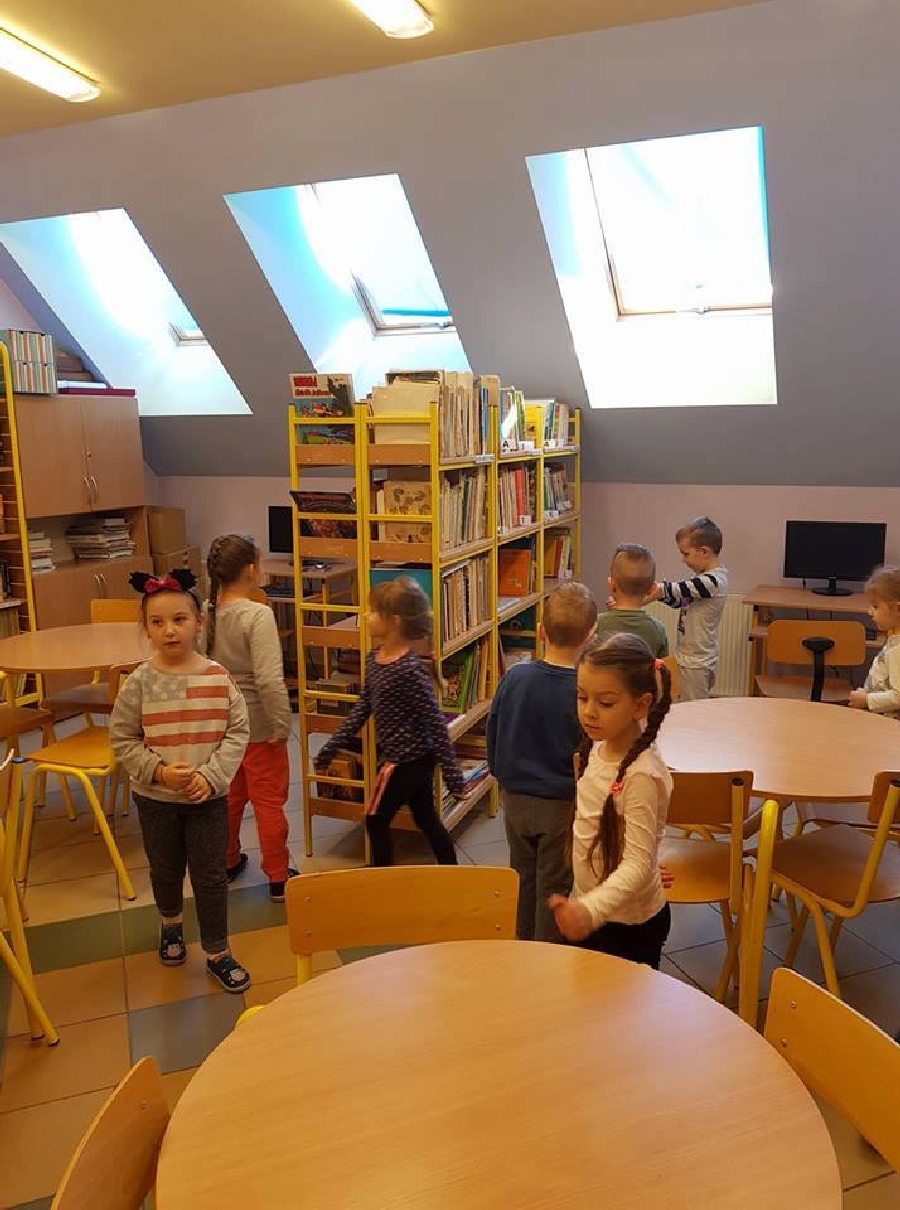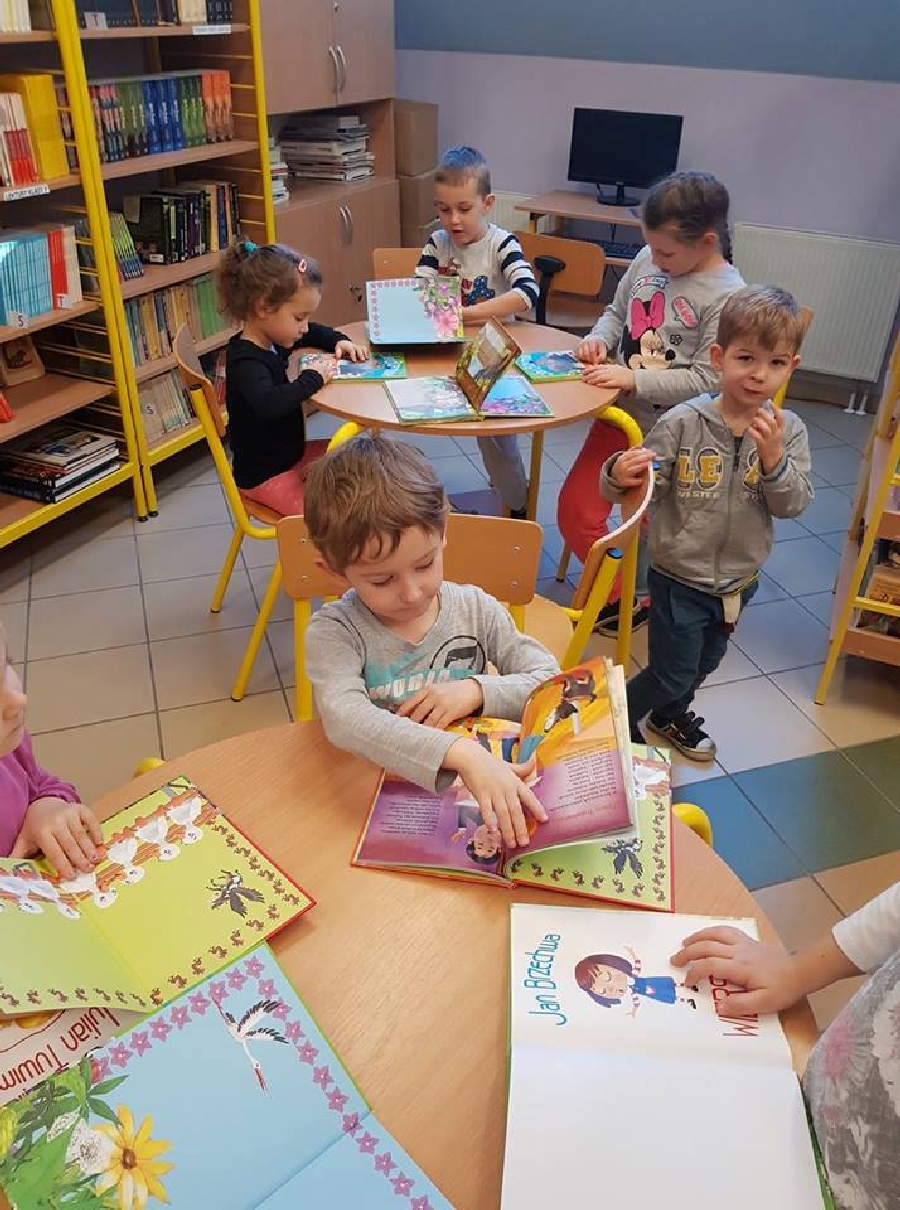 Dzieci z przedszkola odwiedziły szkolną bibliotekę. Pani Bibliotekarka pokazała dzieciom, gdzie znajduje się przeznaczony specjalnie dla nich regał z książkami. Następnie zaprezentowała i dała do obejrzenia dzieciom książeczki z działu dziecięcego. Przedszkolakom bardzo spodobały się kolorowe i bogato ilustrowane książeczki, które z chęcią oglądały. Zobaczyły jak wygląda karta czytelnika oraz poznały zasady wypożyczania książek, zachowania się w bibliotece. Dowiedziały się także jak należy dbać o książki. Spotkanie odbywało się w miłej, pełnej uśmiechów i wrażeń atmosferze. Dla wielu przedszkolaków, była to pierwsza wizyta w „domu książek”, ale na pewno nie ostatnia.