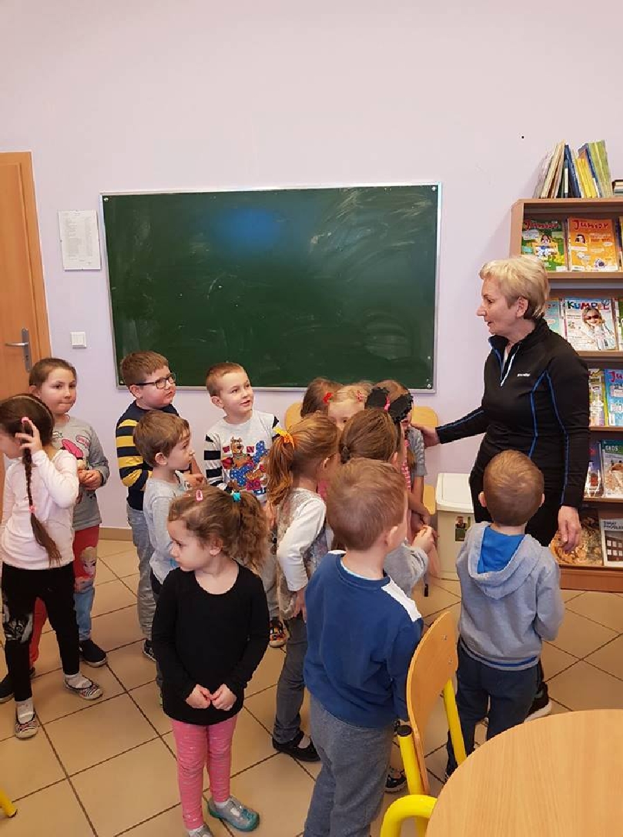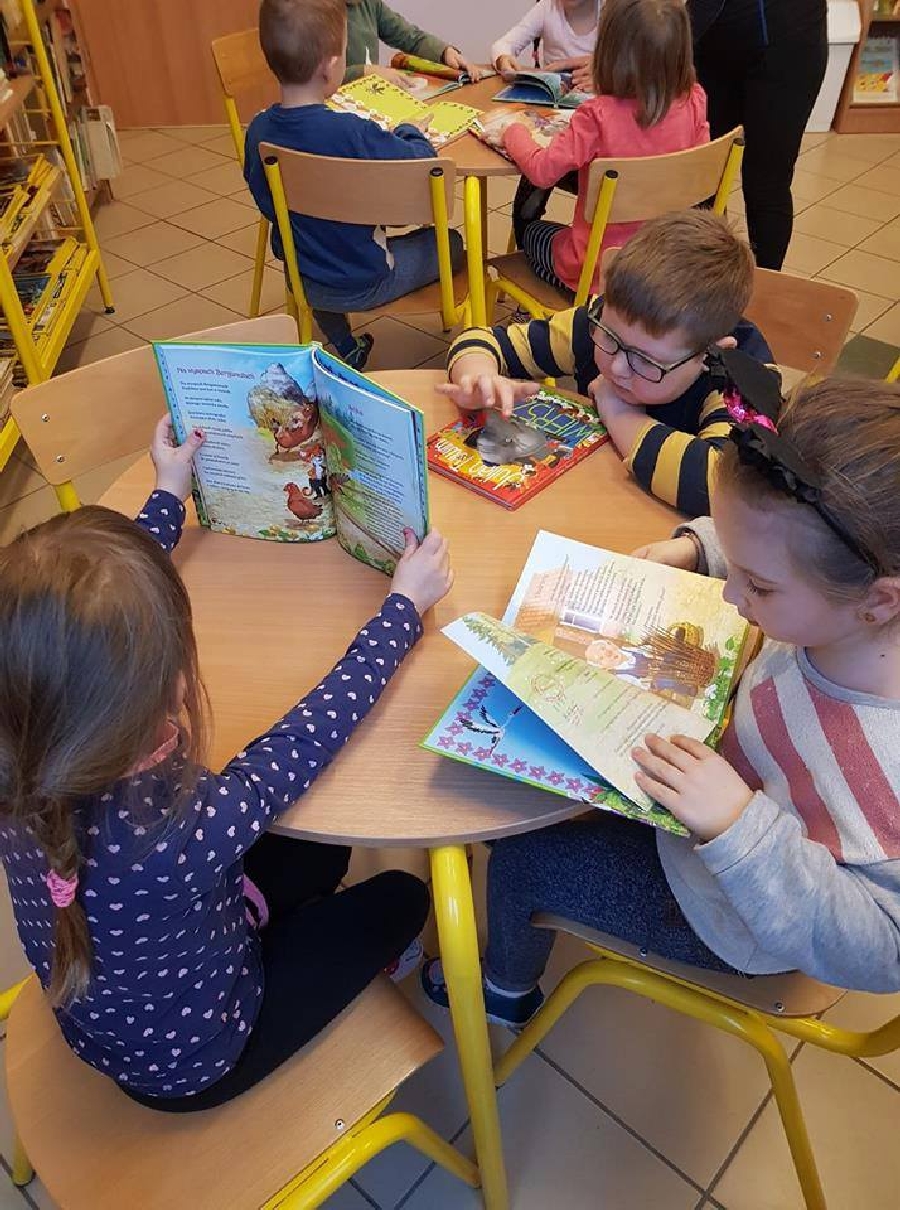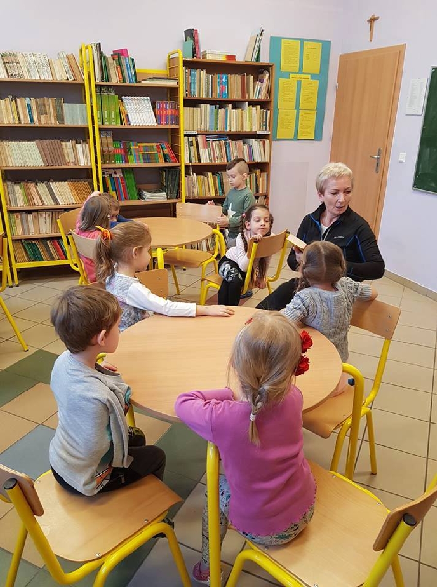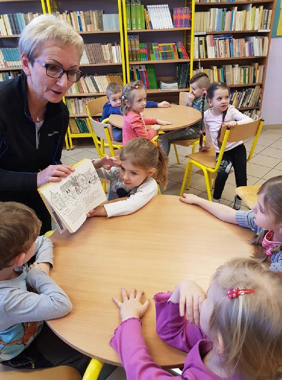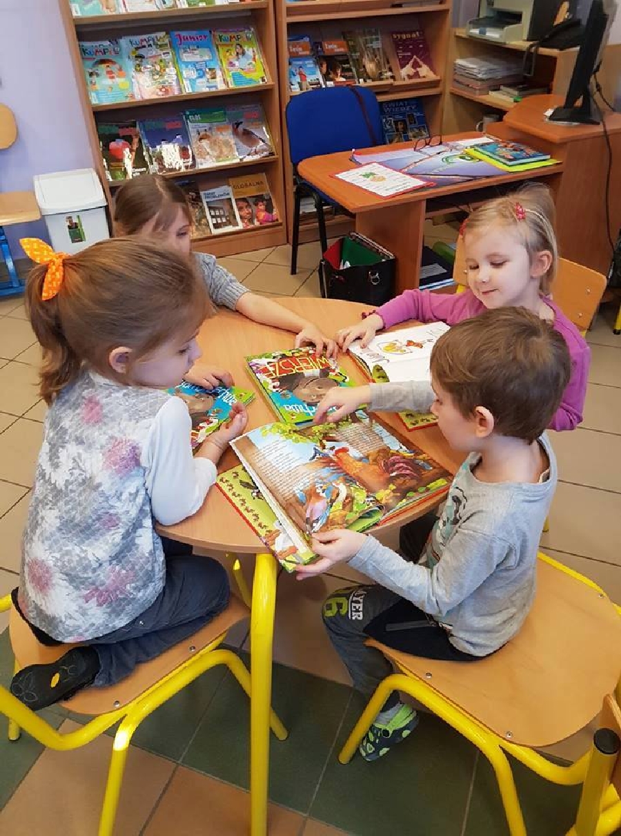 Dzieci z przedszkola odwiedziły szkolną bibliotekę. Pani Bibliotekarka pokazała dzieciom, gdzie znajduje się przeznaczony specjalnie dla nich regał z książkami. Następnie zaprezentowała i dała do obejrzenia dzieciom książeczki z działu dziecięcego. Przedszkolakom bardzo spodobały się kolorowe i bogato ilustrowane książeczki, które z chęcią oglądały. Zobaczyły jak wygląda karta czytelnika oraz poznały zasady wypożyczania książek, zachowania się w bibliotece. Dowiedziały się także jak należy dbać o książki. Spotkanie odbywało się w miłej, pełnej uśmiechów i wrażeń atmosferze. Dla wielu przedszkolaków, była to pierwsza wizyta w „domu książek”, ale na pewno nie ostatnia.
