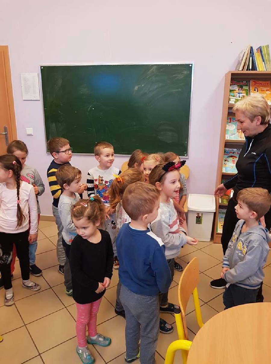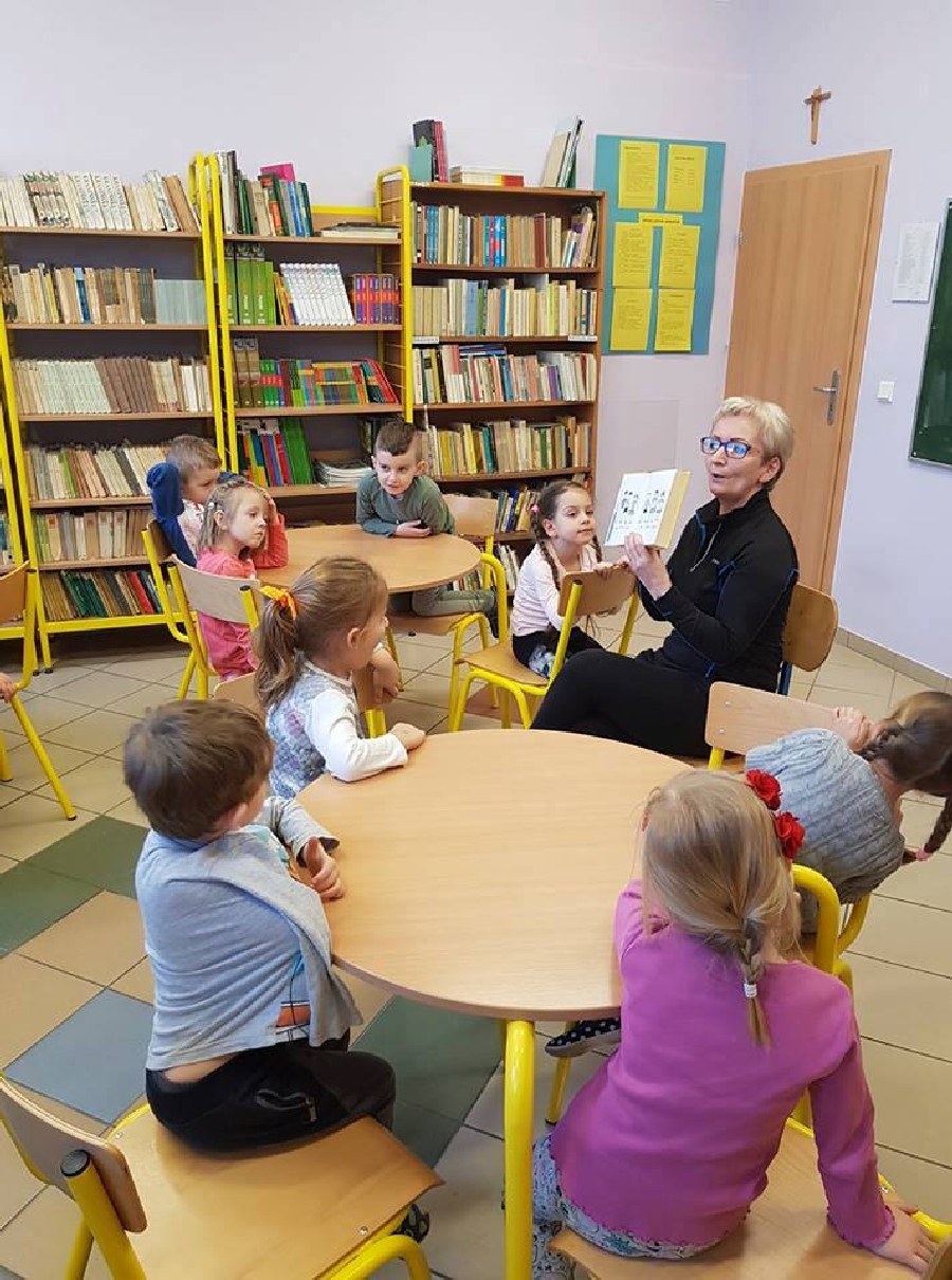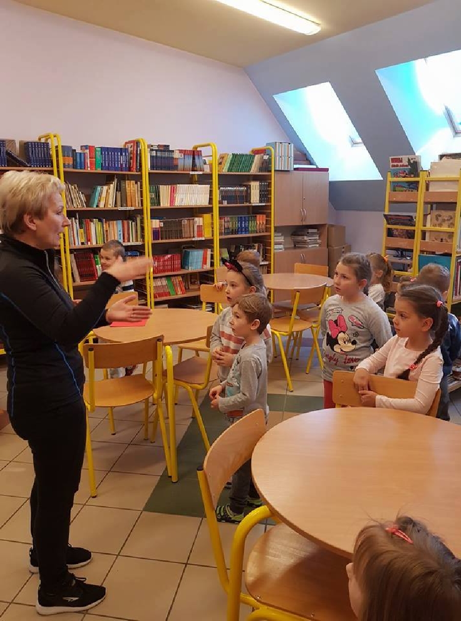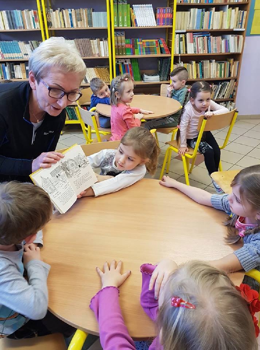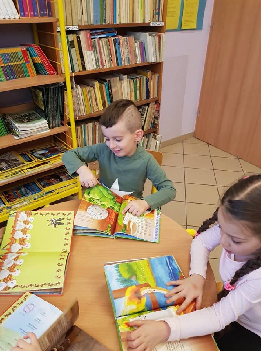 Dzieci z przedszkola odwiedziły szkolną bibliotekę. Pani Bibliotekarka pokazała dzieciom, gdzie znajduje się przeznaczony specjalnie dla nich regał z książkami. Następnie zaprezentowała i dała do obejrzenia dzieciom książeczki z działu dziecięcego. Przedszkolakom bardzo spodobały się kolorowe i bogato ilustrowane książeczki, które z chęcią oglądały. Zobaczyły jak wygląda karta czytelnika oraz poznały zasady wypożyczania książek, zachowania się w bibliotece. Dowiedziały się także jak należy dbać o książki. Spotkanie odbywało się w miłej, pełnej uśmiechów i wrażeń atmosferze. Dla wielu przedszkolaków, była to pierwsza wizyta w „domu książek”, ale na pewno nie ostatnia.