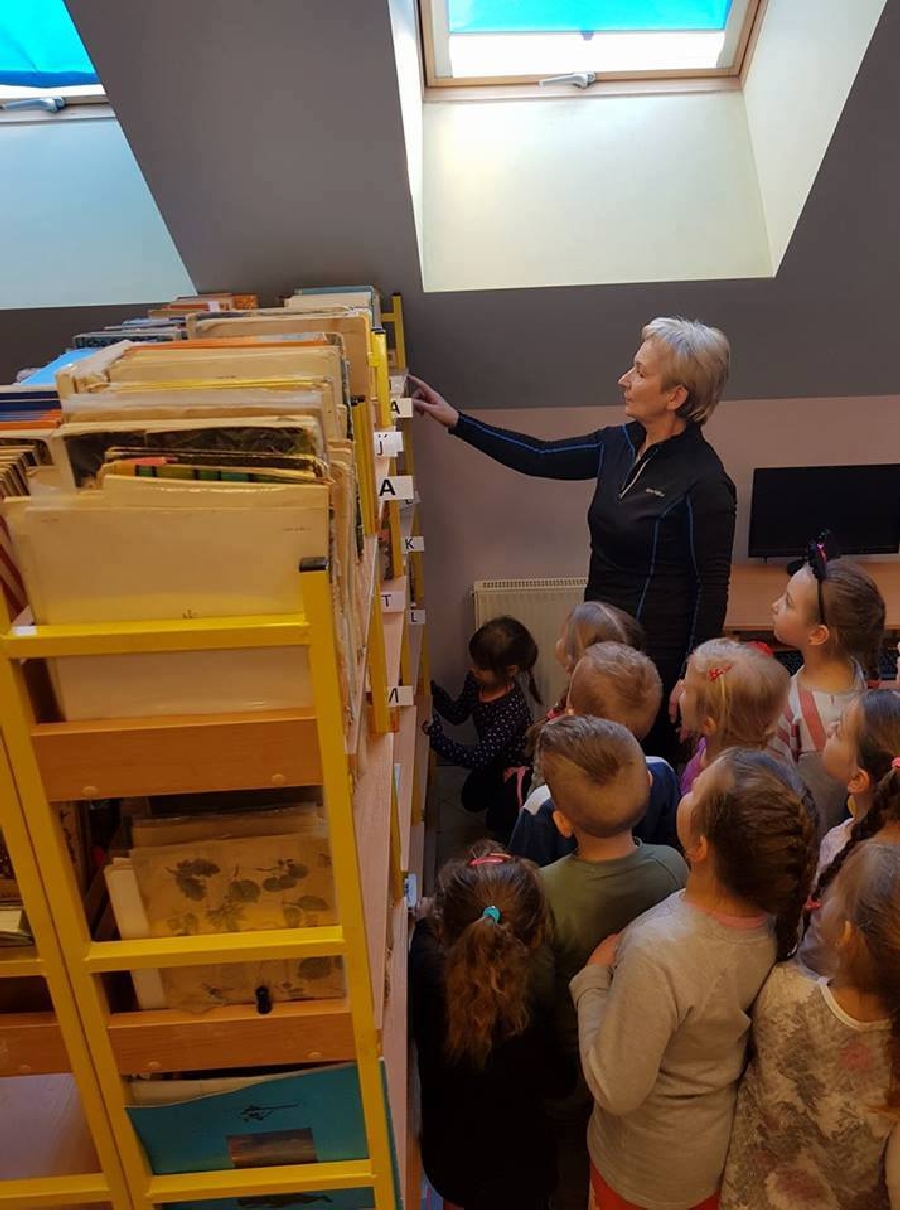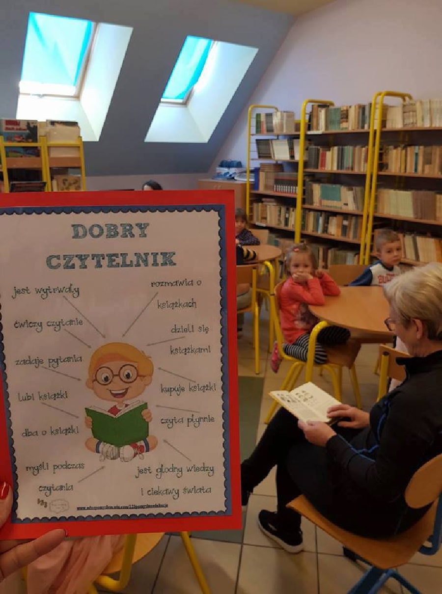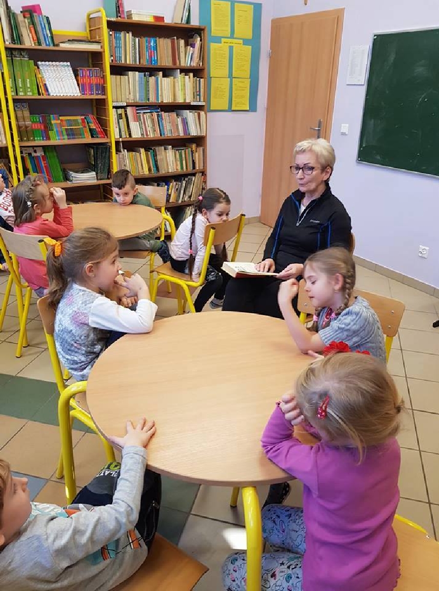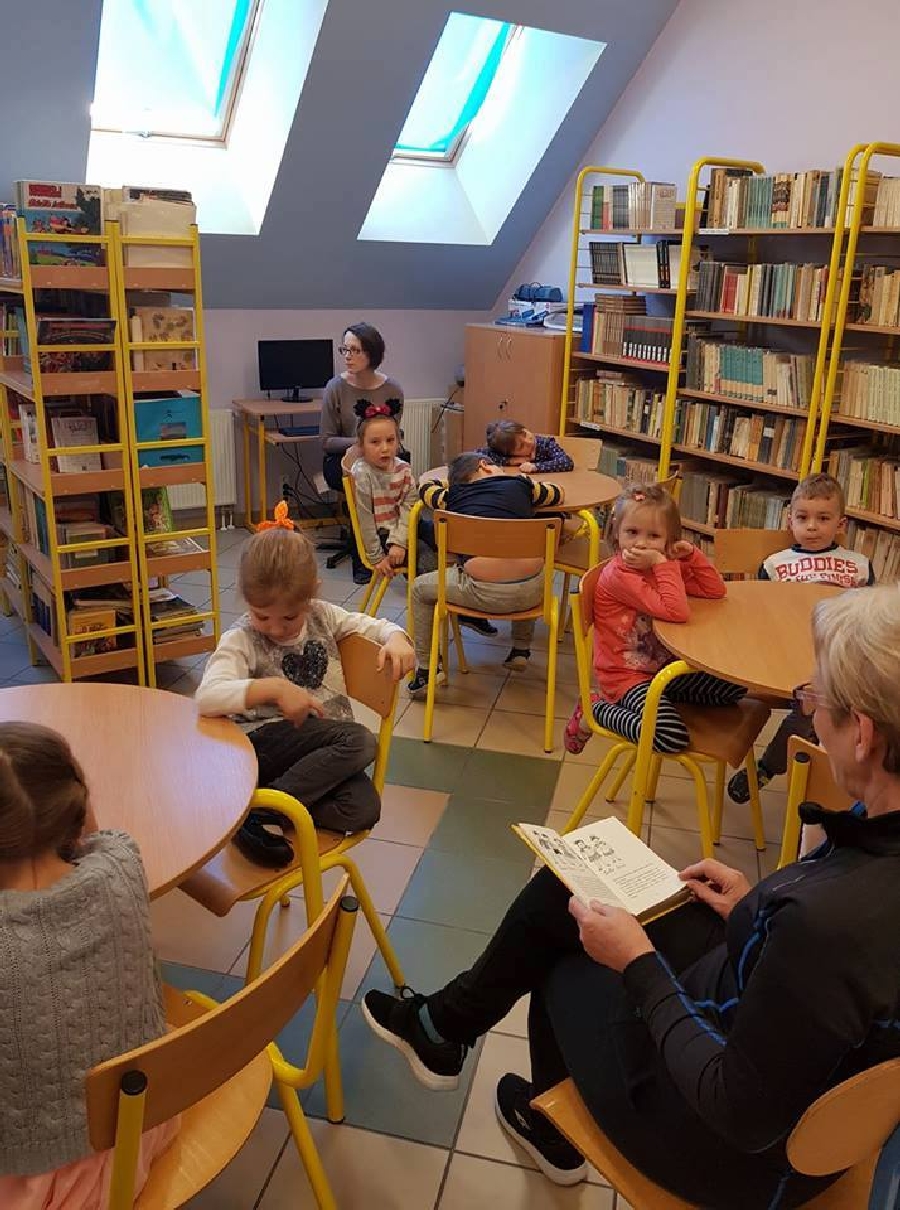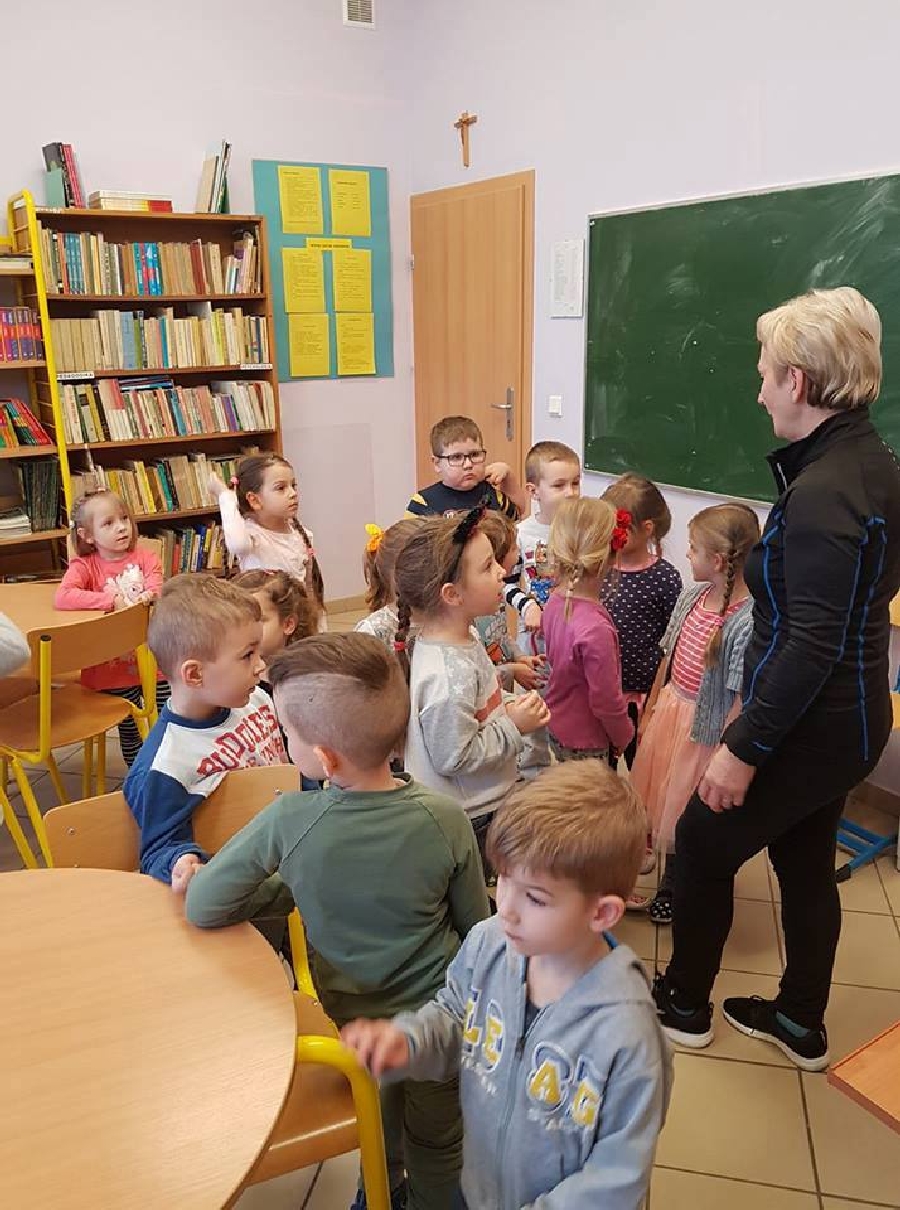 Dzieci z przedszkola odwiedziły szkolną bibliotekę. Pani Bibliotekarka pokazała dzieciom, gdzie znajduje się przeznaczony specjalnie dla nich regał z książkami. Następnie zaprezentowała i dała do obejrzenia dzieciom książeczki z działu dziecięcego. Przedszkolakom bardzo spodobały się kolorowe i bogato ilustrowane książeczki, które z chęcią oglądały. Zobaczyły jak wygląda karta czytelnika oraz poznały zasady wypożyczania książek, zachowania się w bibliotece. Dowiedziały się także jak należy dbać o książki. Spotkanie odbywało się w miłej, pełnej uśmiechów i wrażeń atmosferze. Dla wielu przedszkolaków, była to pierwsza wizyta w „domu książek”, ale na pewno nie ostatnia.