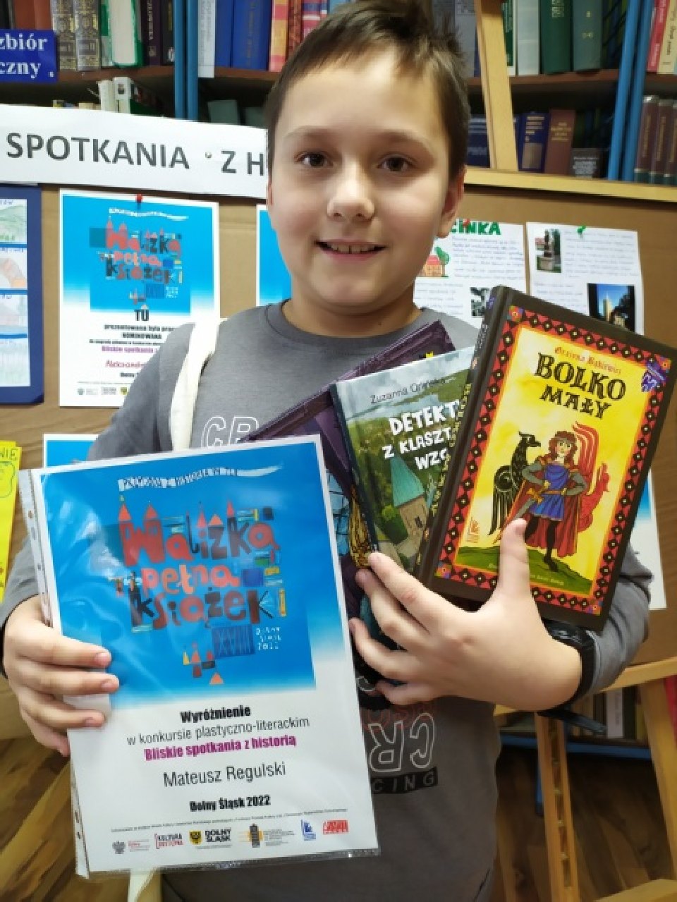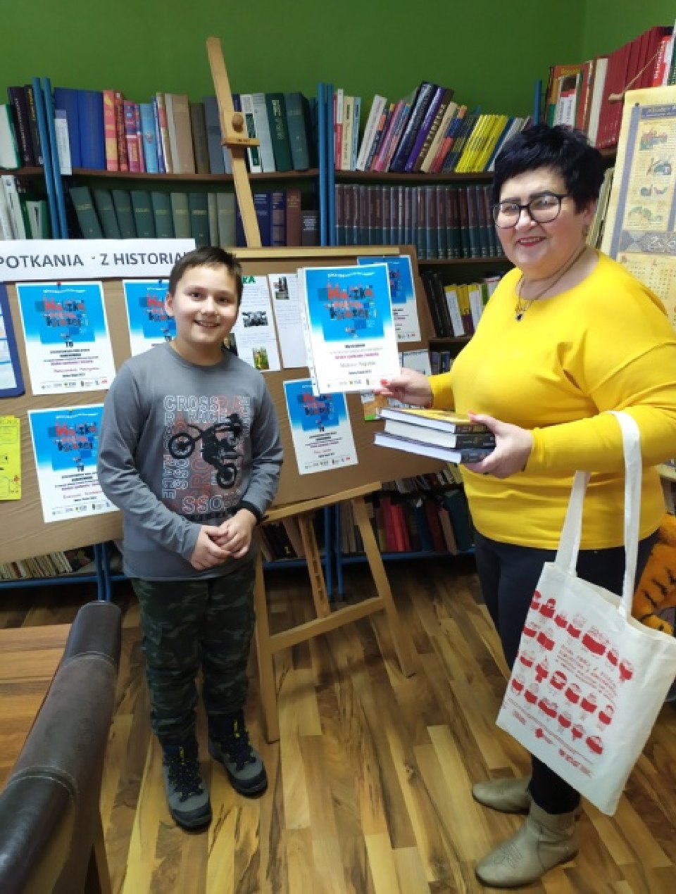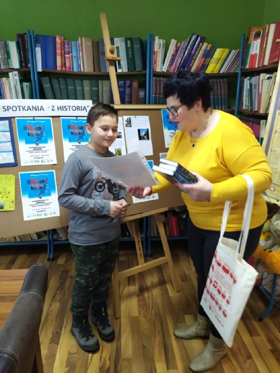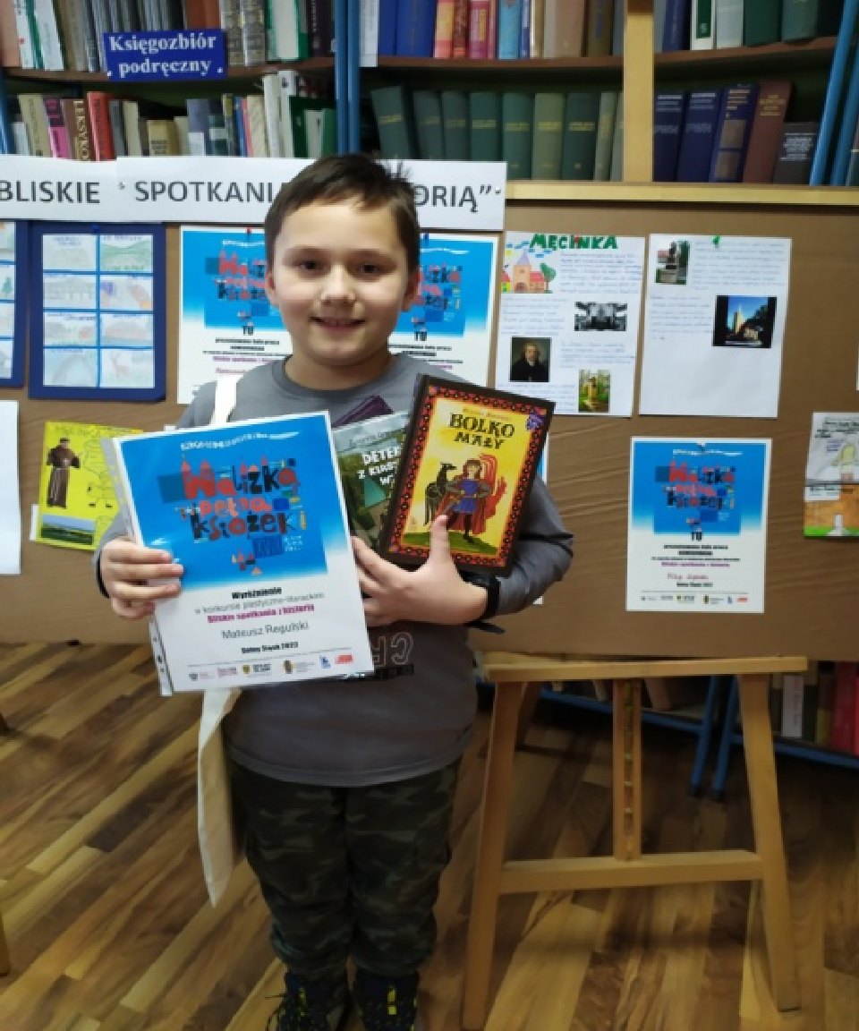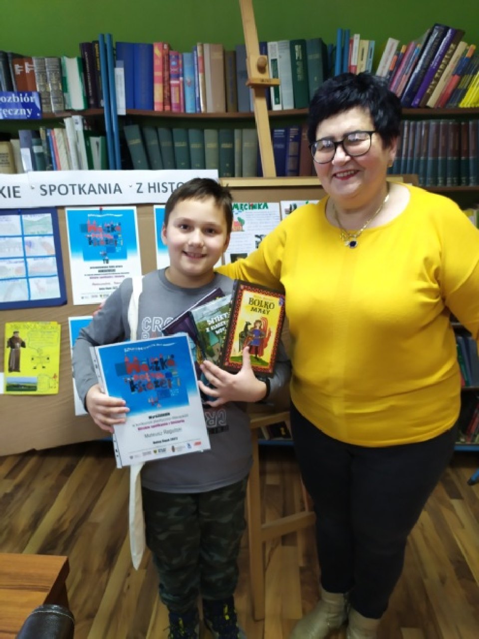 W GBP w Męcince kierownik Elżbieta Chodor wręczyła nagrodę -wyróżnienie w konkursie plastyczno-literackim „Bliskie spotkania z historią”, od organizatora projektu „Przygoda z historią w tle, czyli walizka pełna książek” – Dolnośląskiej Biblioteki Publicznej im. Tadeusza Mikulskiego we Wrocławiu , Mateuszowi Regulskiemu uczniowi kl. IV z Zespołu Szkolno-Przedszkolnego w Męcince, który wykonał prace w formie komiksu „Historia Sichowa”.